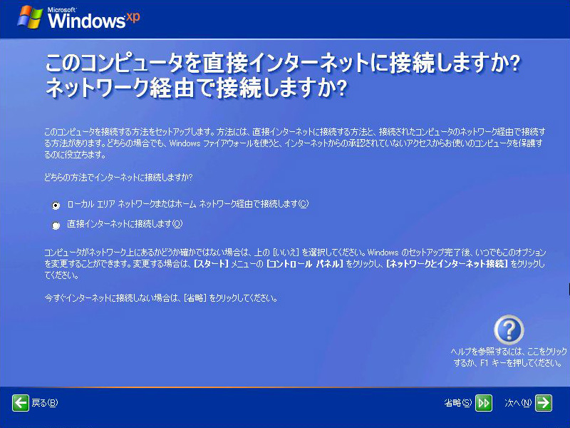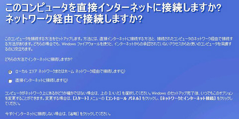 インターネット接続の方法を聞かれるが,分からなければ省略してもかまわない。分かる場合は「ローカルエリアネットワーク(LAN)またはホームネットワーク経由で接続します」か「直接インターネットに接続します」のいずれかを選んで先に進む