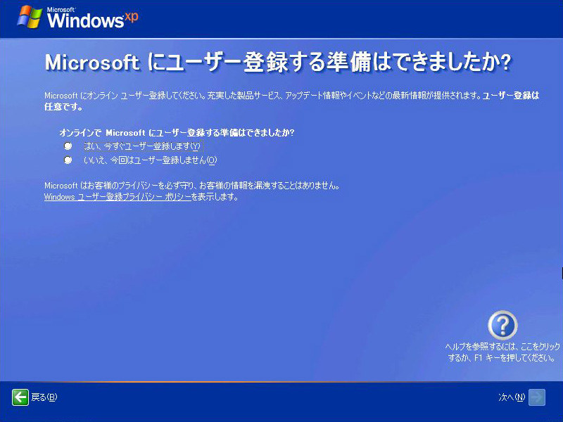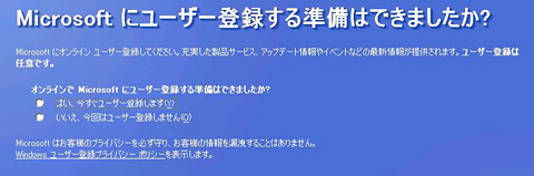 Microsoftにユーザー登録をするかどうか聞かれるが,ここではいったんパスする。ウイルス対策ソフトやファイヤーウォールの設定をしてから,あらためてインターネットに接続して登録しよう