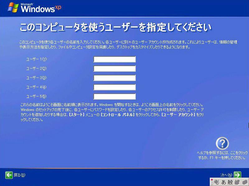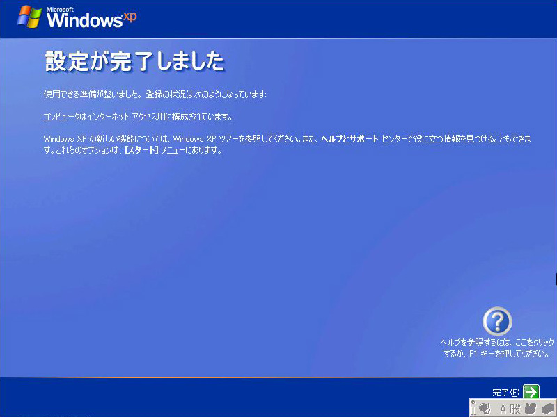 | 「完了(F)」を押せばインストール作業は完了し,Windows XPのデスクトップ画面が表示される |