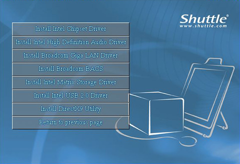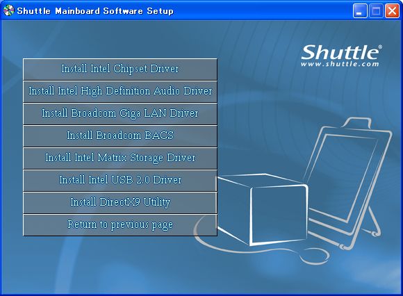 「Shuttle Mainboard Software Setup」というウィンドウが開くので,「Install Mainboard Software」ボタンをクリックする。次の画面で表示されるもののうち,以下のボタンを押してドライバをそれぞれインストールする。