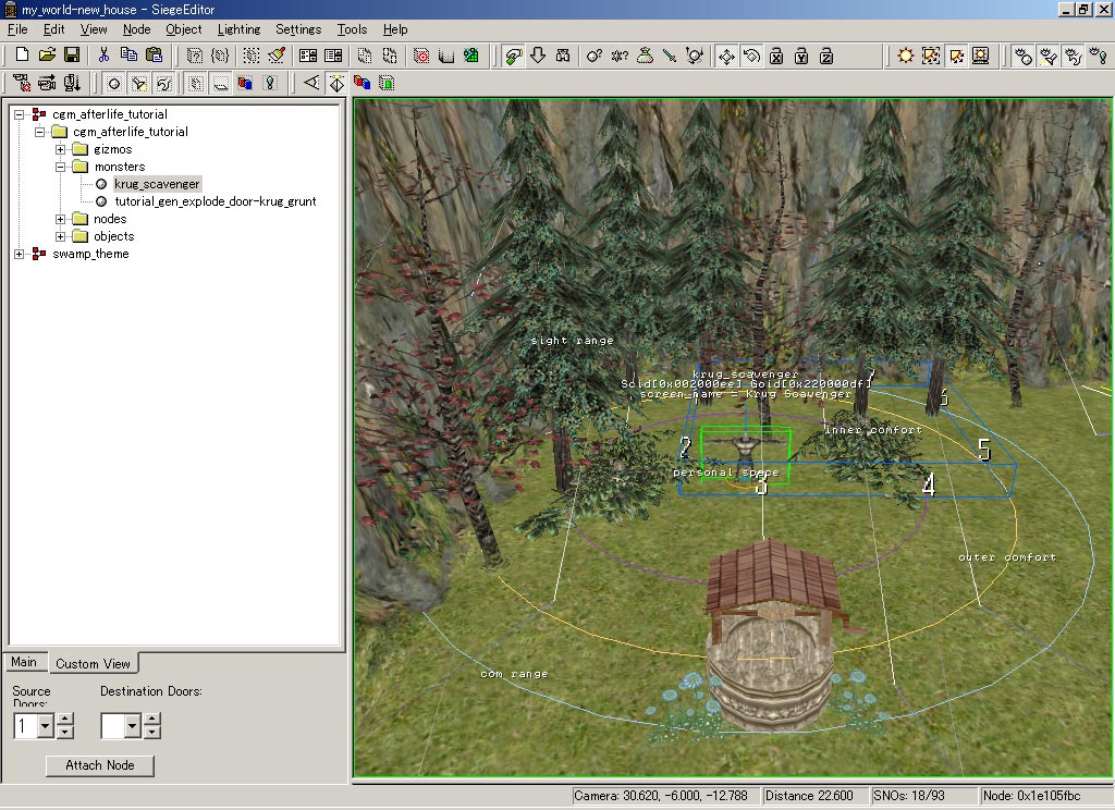 以上でプレイヤーが近づくと破裂してKrug Giantが出現するドアが設置されました。またドア型ジェネレータの周囲に赤い輪が表示されていますが,これは感知範囲を示しています。ゲーム中でプレイヤーがその輪の内側に踏み込むとドアが破裂し,Krug Giantが出現するというわけです。実際のシングルプレイ ゲームでは序版のあたりに同じような仕掛けがありましたのを思い出してみてください。