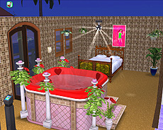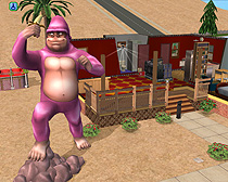 この変わり身の早さこそ,ビジネス成功の要諦だ。私が言うのだから間違いない。ただ単にミラーボールが気に入ったから,という噂もあるが,違うぞ。ディスコなら,必要なのは「DJブース」と床だけ。壁を真っ赤に塗り直し,派手な絨毯を敷くと,ついさっきまでのあやしい風呂屋がたちまちディスコに早変わり。昼間は研究所で働く発明家だが,家に帰るとDJとなり,イェー,エビバディ乗ってるかーい! である。けっこう給料が貯まってきたので,ぐっと奮発して「巨大なゴリラの置物」(ピンク色)を購入して家の前に置いてみた。世間の皆様には「ゴリラのディスコ」と呼んでもらいたいのだが,シム語なので,いかんともしがたい。残念。