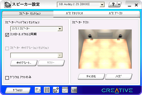 スピーカー設定。スピーカーが正しく設定されているかのテストと,低域強調(バスブースト)を行う。また,なぜかここにデジタル出力の設定がある |