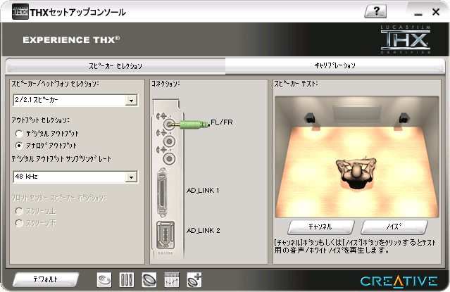 UIは「EAXコンソール」「スピーカー設定」「THXセットアップコンソール」「SURROUND MIXER」「GRAPHIC EQUALIZER」の5種類。スピーカー設定が二つあり,それらがどういう意味なのかいっさい説明されていないほか,ウインドウごとにタブが用意されていてすべての項目を一覧できない,ウインドウを開くごとに数秒待たされるといった具合で,あまり褒められたものではない。