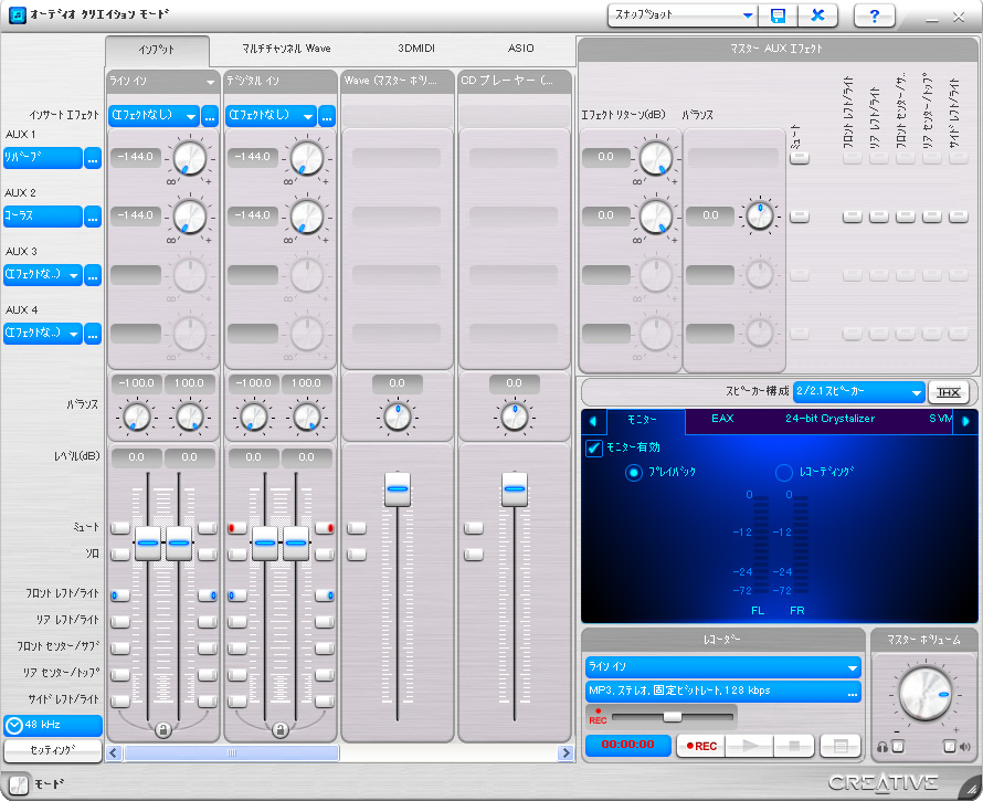 | カラオケモードなど,ゲームに無関係の項目が省略され,すっきりしたCMSS-3D(これについては後述)関連項目。Audigyに比べて全体の設定をスッキリ見渡せるようになった |