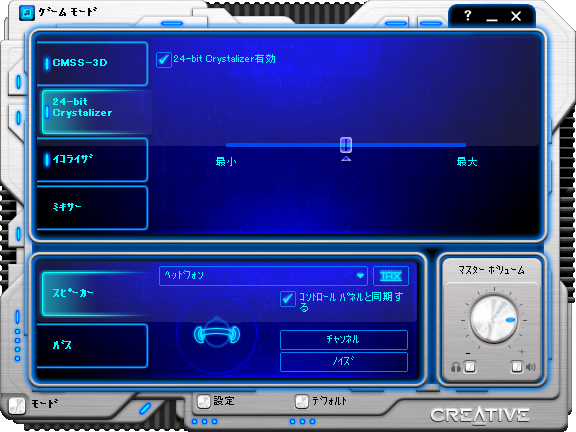 ゲームモードだとタブから有効/無効を選択できる24-bit Crystalizerだが,視聴した印象で大ざっぱにまとめると,サウンドの低域と高域を強調する機能である。