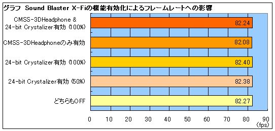結果はグラフにまとめたとおりだ。さすがは高性能を謳うサウンドチップということか,CMSS-3DHeadphoneや24-bit Crystalyzerを有効にしても,フレームレートが目に見えて落ちることはなかった。