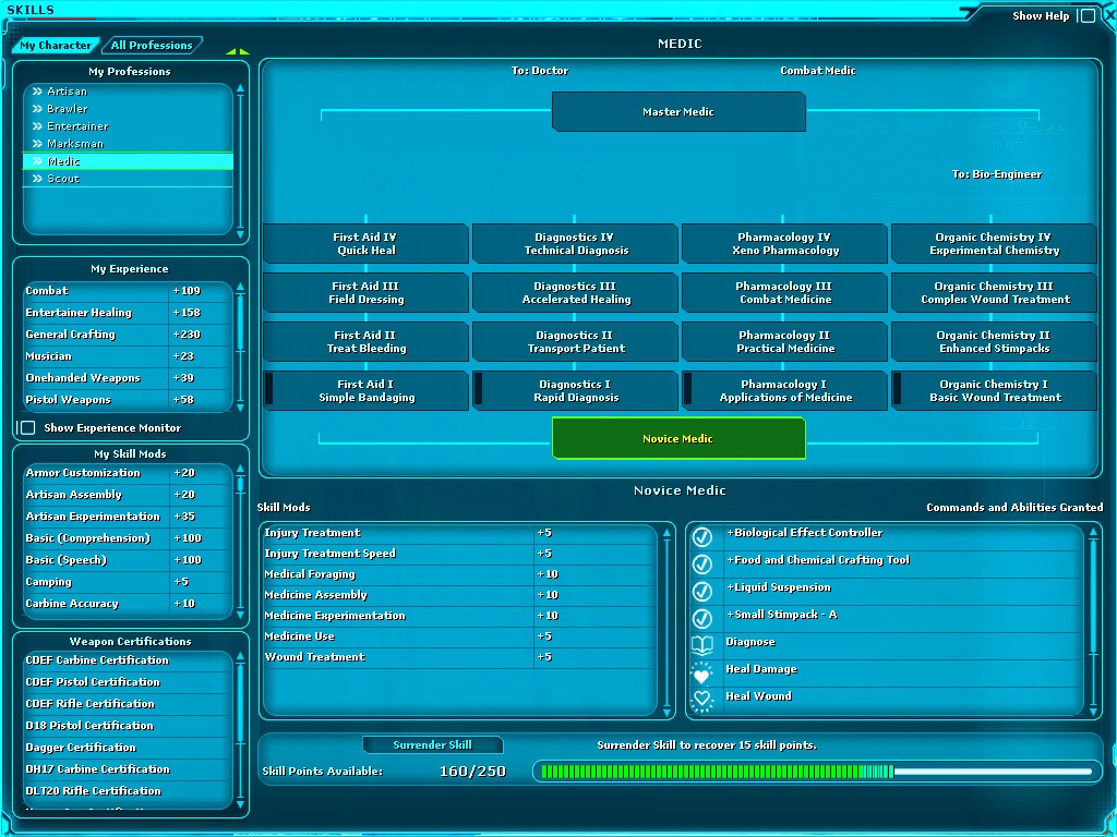 それならば,基本的な回復能力や資源採集の能力,生産能力をとりあえず自分で習ってしまい,活用しつつメインの能力を伸ばしていったほうがプレイの効率は上がるはずだ。それらは,いつか本当にスキルポイントが足りなくなったときにSurrender(スキル放棄)すればよい。Surrenderはいつでも可能だし,クレジットもかからず,スキルポイントはそのまま還ってくる。それに,Starting ProfessionのNoviceスキルを取るのに必要なクレジットは,たったの100クレジットだ。いろいろなProfessionを経験して得た,その職業の性質や仕組みに関する知識は,今後プレイを続けていくうえで大きな助けとなってくれる。将来自分のキャラクターを育てる方向性を決める,良い材料にもなることはいうまでもないだろう。