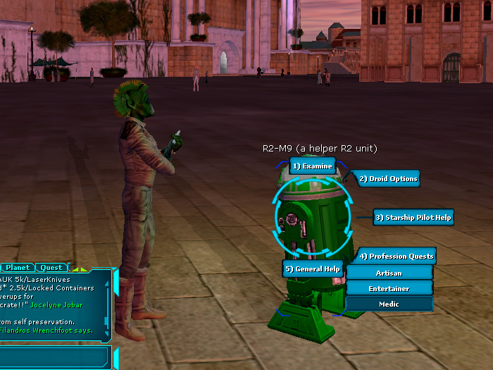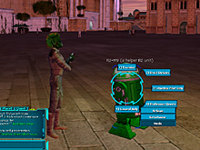 基本操作のチュートリアルを終えて好みの星に降り立つと,緑色の"AstromechDroid"が現れて,ヘルプが必要かどうか聞いてくる。このドロイドのヘルプはStarting Professionごとに用意されており,指示される通りにプレイを進めていけば,その職業の基本的な機能と操作方法が理解できる。すこしうるさく感じるかもしれないが,このドロイドによるトレーニングはぜひ活用しよう。基本操作の理解に役立つだけでなく,指定される簡単なタスクをこなしていけば,クレジット(お金)や経験値,アイテムがもらえるのだ。いくつかのStarting Profession用トレーニングを実行すれば,初期段階では十分な量のクレジットを最終的に入手できる。
