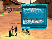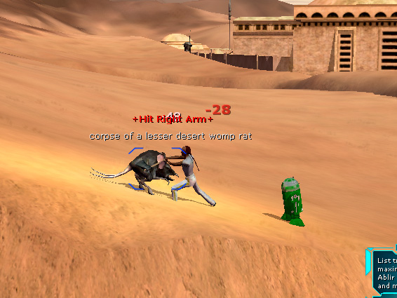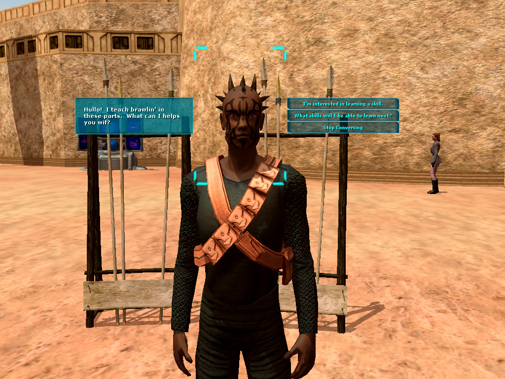 SWGのキャラクターは,スキルを自動的には覚えない。Experienceを必要なだけ溜めたあとに,誰かに教えてもらうことで初めて習得する。この段階ではOne-Handed,Two-Handed,Polearm,UnarmedのスキルはBrawlerのトレーナーが,Pistol,Carbine,RifleのスキルはMarksmanのトレーナーが教えてくれるので,もし溜まっていたらすぐに習ってしまうことをお勧めする。1000クレジットかかるが,このままHelperドロイドのトレーニングを続けていれば,この程度のクレジットはすぐに取り返せる。スキルアップしておけば,このあとの戦闘がラクになるはずだ。