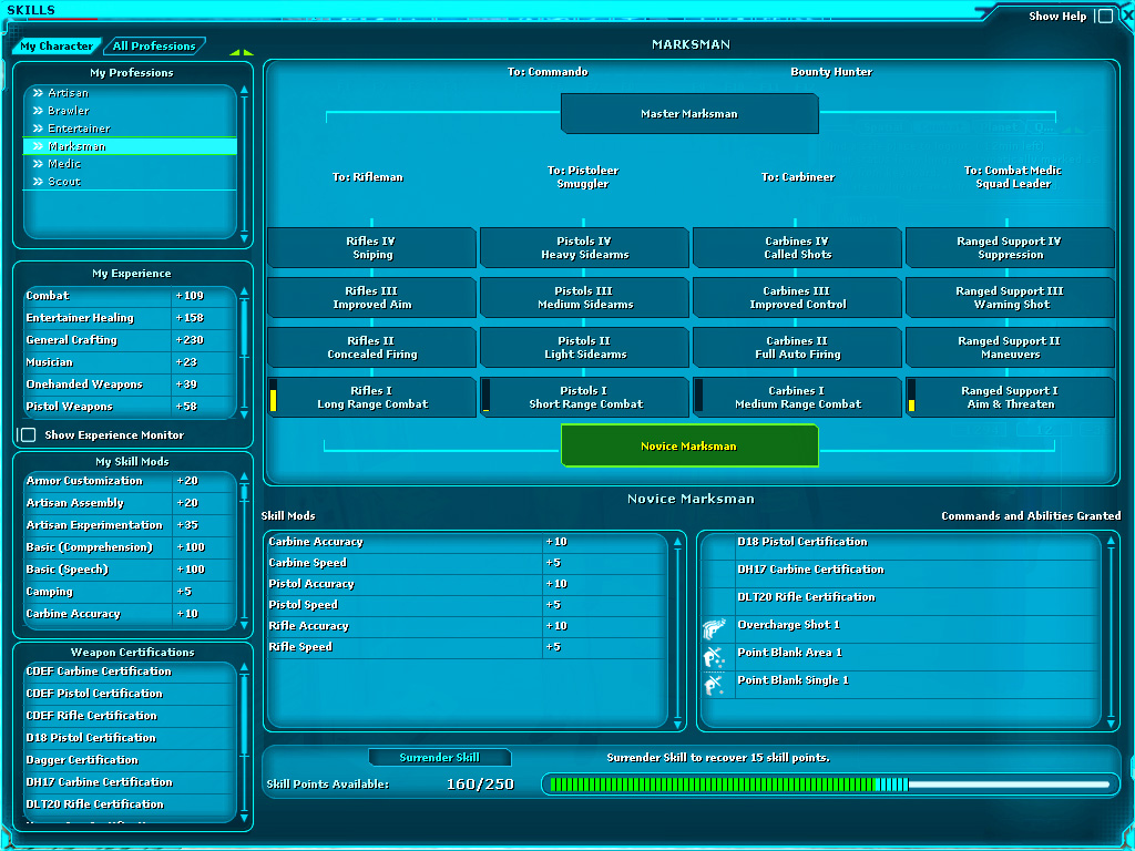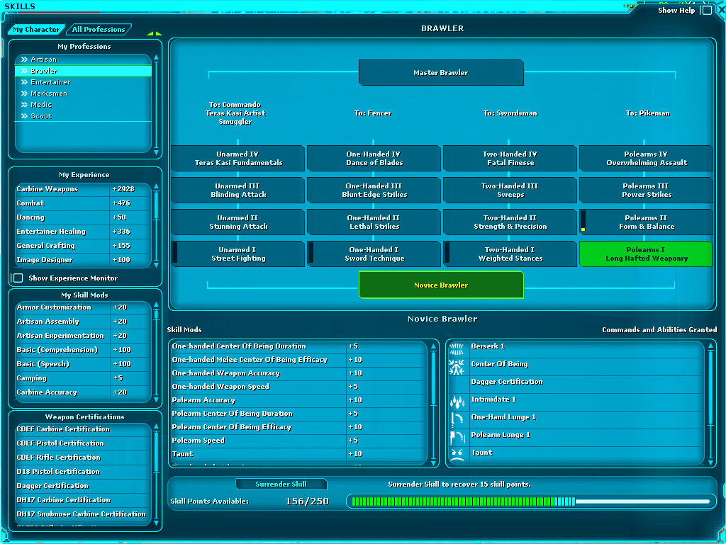 Brawlerは"BrawlerTrainer",Marksmanは"MarksmanTrainer"から習える。トレーニングには100クレジットが必要だが,これは初めから持っているお金を利用しよう。トレーナーは最初に降り立った町の中に必ずいる。恐らくスターポートの入り口付近で見つかるはずだ。"/find"コマンドを使って現れるリストの中から選択すれば,現在地からトレーナーまでの道筋が画面に表示されるので,これを利用するのも良いだろう。