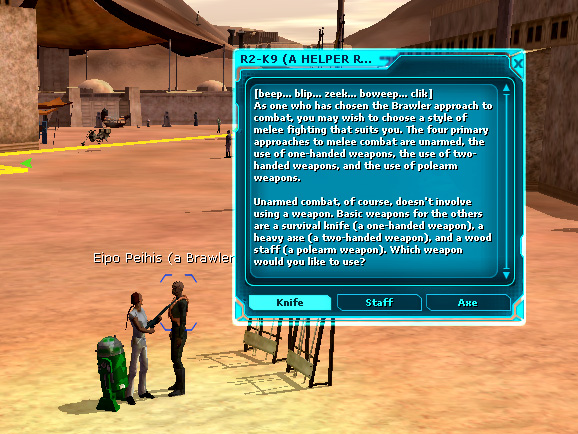 HelperドロイドからはKnife,Axe,Staffのうち好きなものを一つもらえる。これらはBrawlerが伸ばしていける四つのスキルブランチのうち,三つに対応している。SWGでは戦闘に使用した武器のタイプによって,得られる経験値の質が異なってくるのだ。