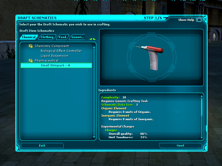 今後自分でStimpackを作りたい場合には,これらの資源を自力で集める必要がある。ここまでにScoutとArtisanを経験してきた人であれば,手近な資源の集め方はもうお分かりだろう。InorganicはMineralSurveyingDeviceやChemicalSurveyDeviceを使ってSurveyし,埋蔵量の多いものを足下からSampleすれば手に入る。Organicは,倒した生物からHarvestすればいいのだ。