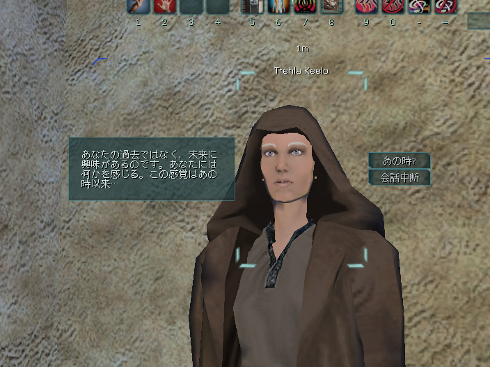 たどった先にはローブを着込んだトレーラ・キーロ(Trehla Keelo)という女性が待っている。ちょっとした問答の後,トレーラはトレーニングを提案してくるので,それを受けよう。彼女はSWGの基本事項を一つずつ指導してくれる。