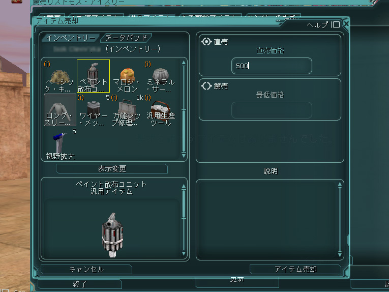 次はバザー・ターミナルに行って,「ペイント散布ユニット」を売りに出すことに。ターミナルをダブルクリックすると「競売リスト」のウインドウが表示される。アイテムを売る場合は,まずウインドウ上部の「出品アイテム」タブを選択,その後に下部に並んでいるボタンの中から「アイテム売却」を選ぶ。売却用のウインドウが表示されたら,目的のアイテムをクリックで選択しよう。