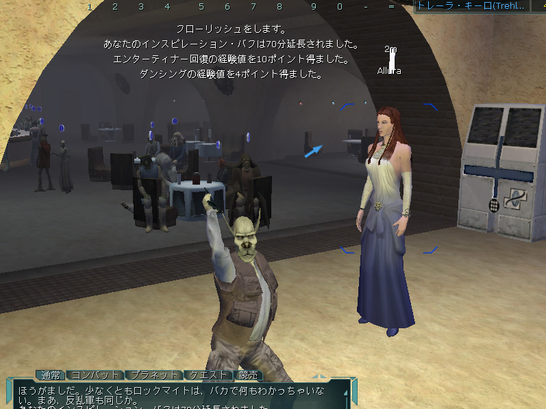 話しかけるべきNPCの名前は,"Allura"だ。彼女の前で2分間パフォーマンスを披露すれば,このパートは終了する。ダンスや演奏をすることで得られる「インスピレーション・バフ」("バフ"とは"強化作用"のこと)は,以降も自分でカンティーナにパフォーマンスしにくることでかけられる。