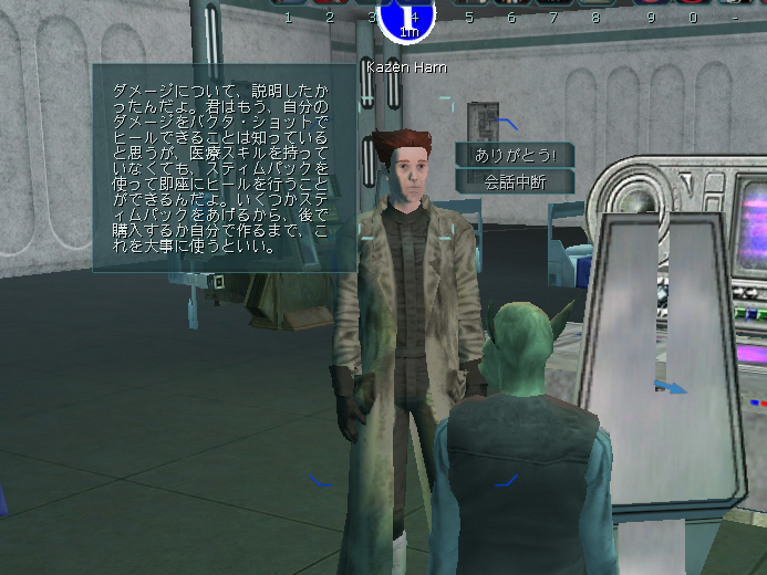 このパートは,NPCに会うだけで終了する。医療センター内で探すべきNPCの名前は"Kazen Harn"だ。彼は「インスタント・スティムパック」というアイテムをくれる。これはヘルスの回復薬で,インベントリーからツールバーにドラッグ&ドロップして,バクタ・ショットと同じようにアイコンを押すことで,自身や対象を回復できる。バクタ・ショットはアイテムを消費せずに使えるスキルだが,こちらは使うたびにスティムパックが一つずつ消費されていく。