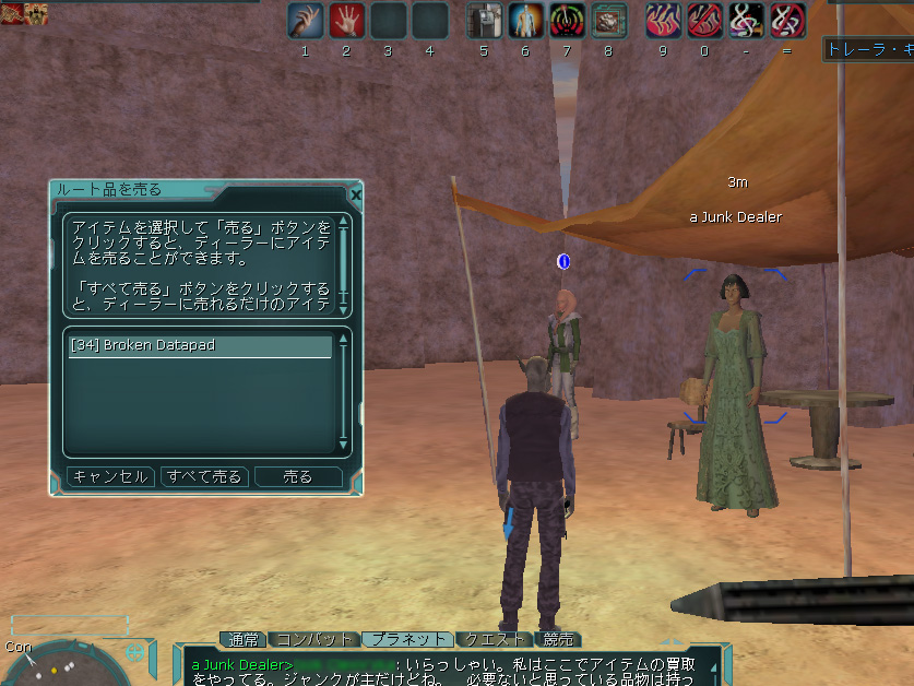 その次は,とりあえず「直売」と書いてある部分に値段を入力する。値段は好きに設定してかまわない(最大値は20000クレジット)。最後に「アイテム売却」ボタンを押せば終了だ。