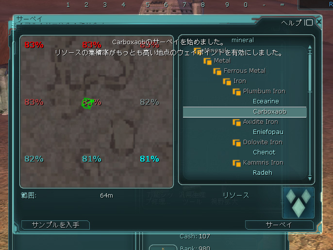 「金属」は「無機物」の仲間だ。だからメタルの埋蔵状態をサーベイ(調査)したいときには,「無機物・サーベイ・デバイス」を使用する。デバイス上で金属のツリーの下位に属している鉱物はすべて,いま求められている"金属"であると見なされるので,その中のどれを採掘してもこのパートはクリアできる。