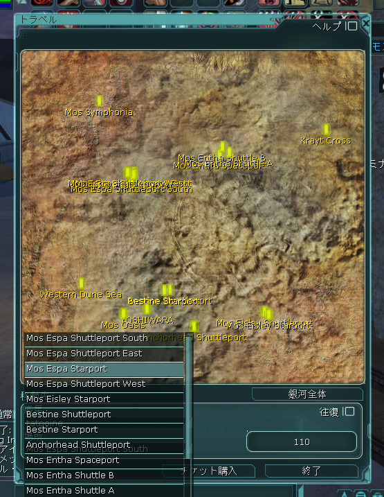 トレース・ライソン(Trace Lyson)はモス・エスパのスターポートの外に立っている。ズバリその地点にウェイポイントが出ているので,すぐに分かるはずだ。帰るときにもシャトルを利用すればよい。なお,最初にいた町の名前は"モス・アイズリー"(Mos Eisley)だ。