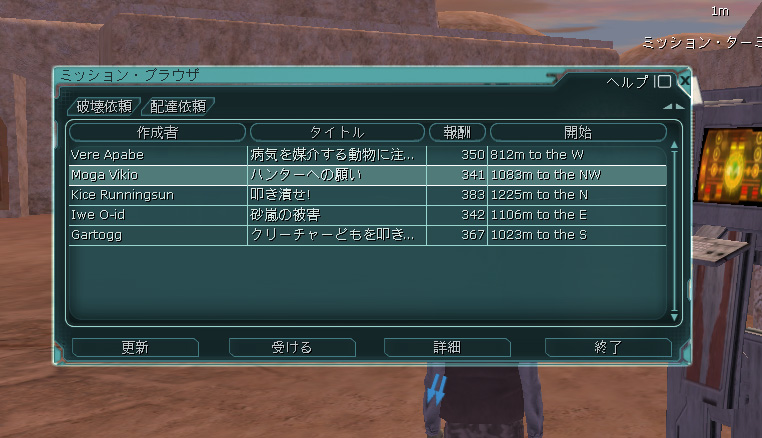 ターミナルのメニューから「リスト」を選ぶと,現在取得可能なミッションがリストアップされる。ウインドウ上部のタブで「破壊依頼」と「配達依頼」が選べるが,今回は破壊依頼を選択する。どのミッションを選んでもよいが,ここでは動物(クリーチャー)の巣を破壊するミッションをお勧めする。難易度の確認もここでできるので,初めは簡単なものから試していくとよいだろう。