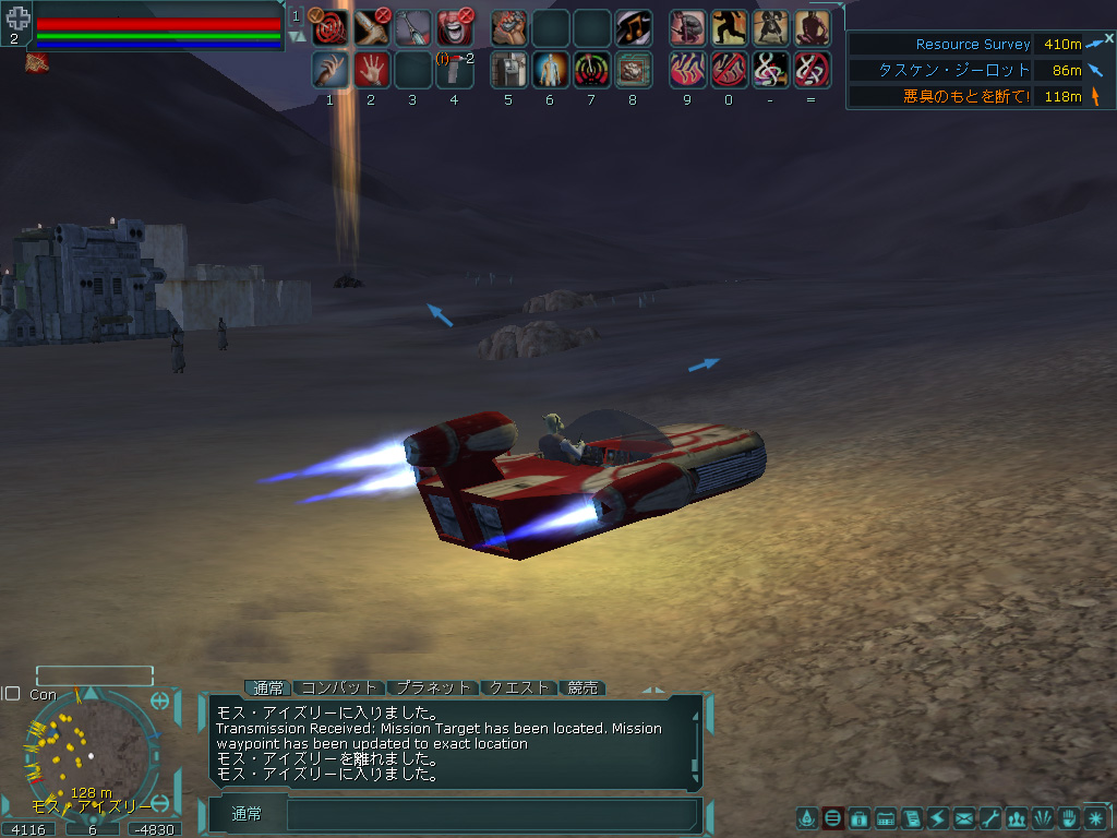 宇宙船内でのチュートリアルを終えると,すべてのキャラクターは惑星タトゥイーンの町の一つであるモス・アイズリーに降り立つ。見回すと地面に黄色いリボンが表示されているので,まずはこれをたどっていこう。