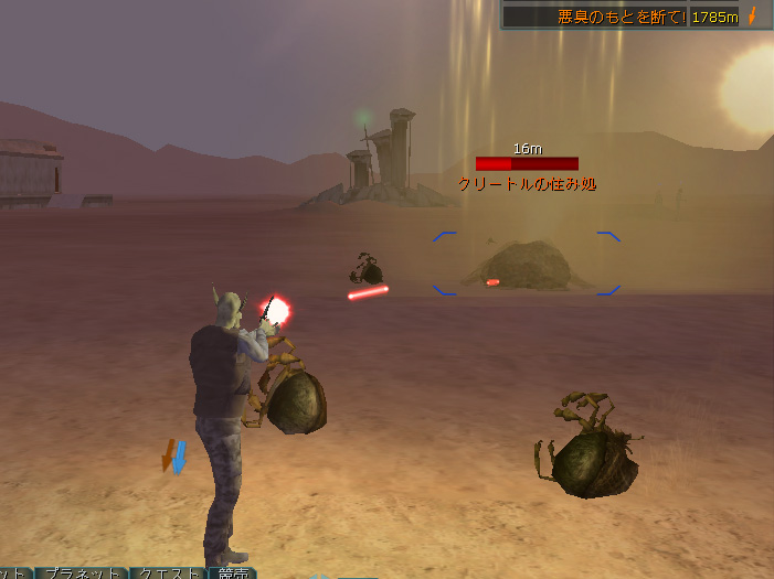 ミッションを取得すると,画面上にオレンジ色の矢印が表示される。この方向に壊すべき目標物がある。自分の足で移動すると時間がかかるので,ランドスピーダーを利用して目的地へと向かおう。