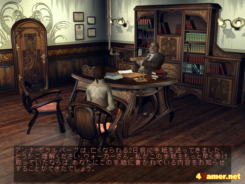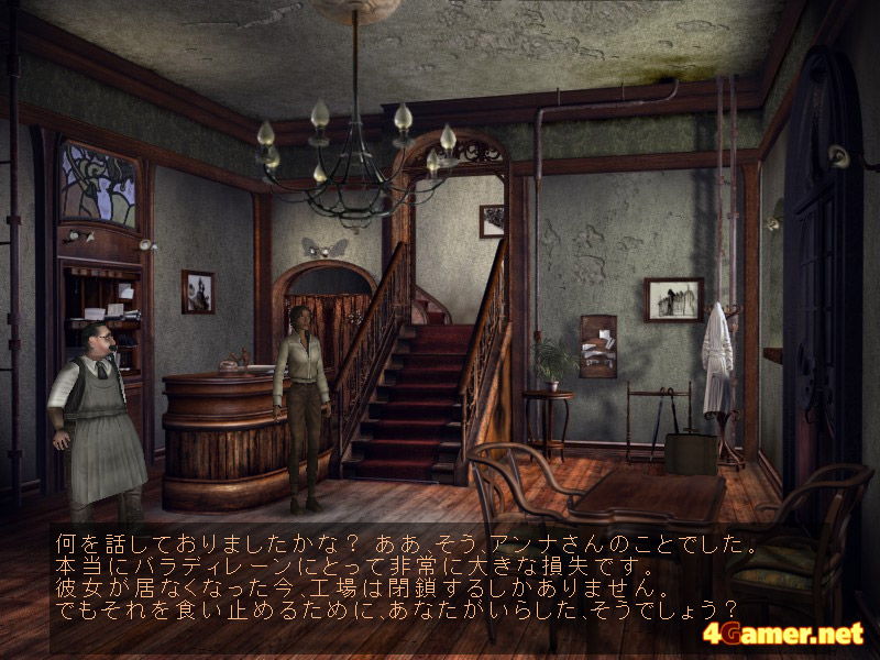 家の中には,いくつか気になるものもあるだろうが,とりあえずは奥に進んで公証人に会おう。ここでケイトは,すでに死んだと思われていた,アンナの弟ハンスが遠くシベリアの地で生存していることを知る。ケイトの弁護士としての仕事は,新しく工場の相続人となったこのハンスと会わければ,成し遂げられないわけだ。