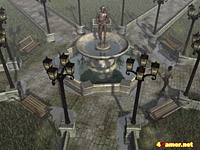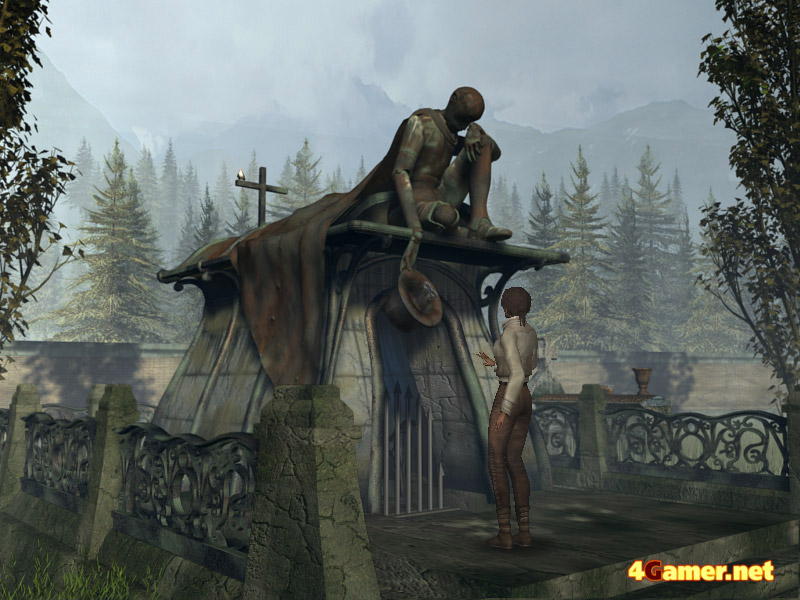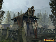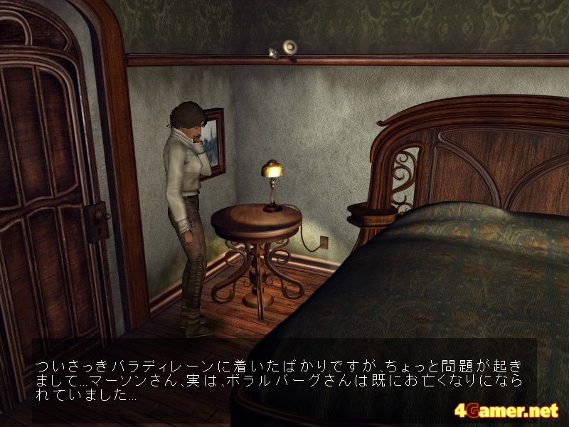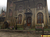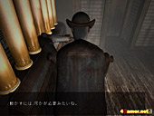 ホテルを出て,画面で右方向(ケイトから見れば左だが,便宜上,今後"左右"は,画面に対しての方向を示す)に進んでいくと,教会にたどり着く。しかしまだオープニングで見た葬式の真っ最中のようで,入ることができない。ケイトが目指す公証人の家は,ホテルを出て,左方向である。