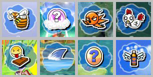 通常のアイテムは全部で八つ。アイテムによって効果は異なるが,それぞれさまざまな方法で他プレイヤーの走行を邪魔できる。アイテムの効力を覚えて,効果的に使用しよう |