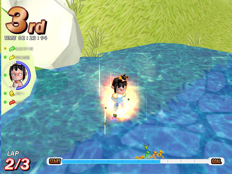 怒りゲージはフィールドの障害物や,ほかのプレイヤーの妨害を受けると徐々に溜まっていく。そして怒りゲージとスタミナゲージが満タンの状態で,ジャンプキーとダッシュキーを同時押しすれば,一定時間憤怒モードが発動するのだ。