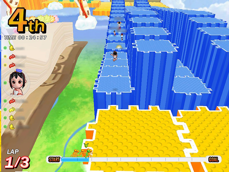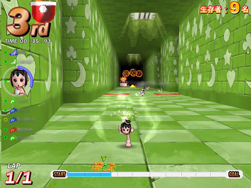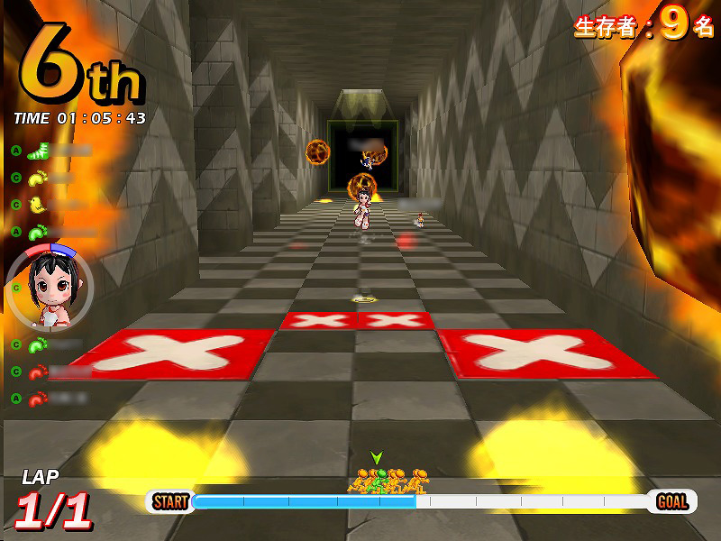 「トカゲオジサンの怒り 初級」は,30人競争専用のサバイバルコース。ほかのコースとは違い,長い直線コースを画面奥から画面手前に向けて,後方から迫り来るトカゲオジサンの攻撃を避けつつ,完走するのが目的となる。