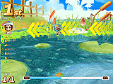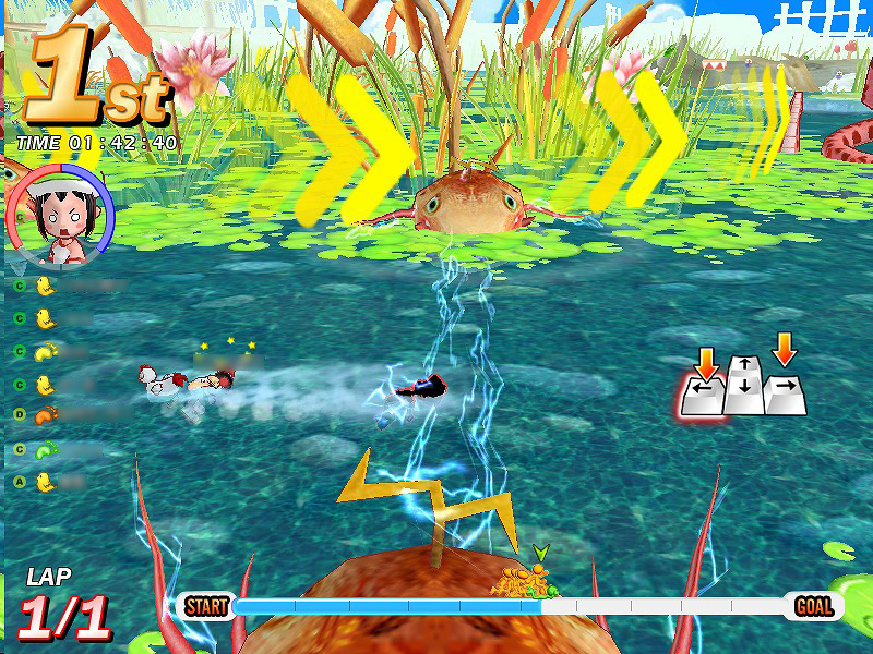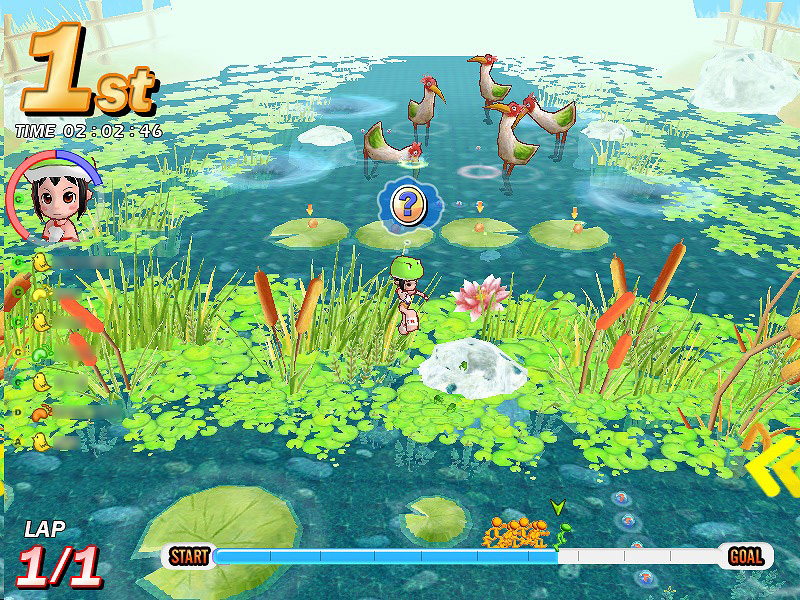 水流が渦巻く中盤は,しっかり迂回して飲み込まれないように。もしも引っかかってしまったら,ジャンプキー連打で抜け出そう。またところどころに,上に乗れるハスの葉があるので,そこで二段ジャンプすれば一気に距離が稼げるぞ。