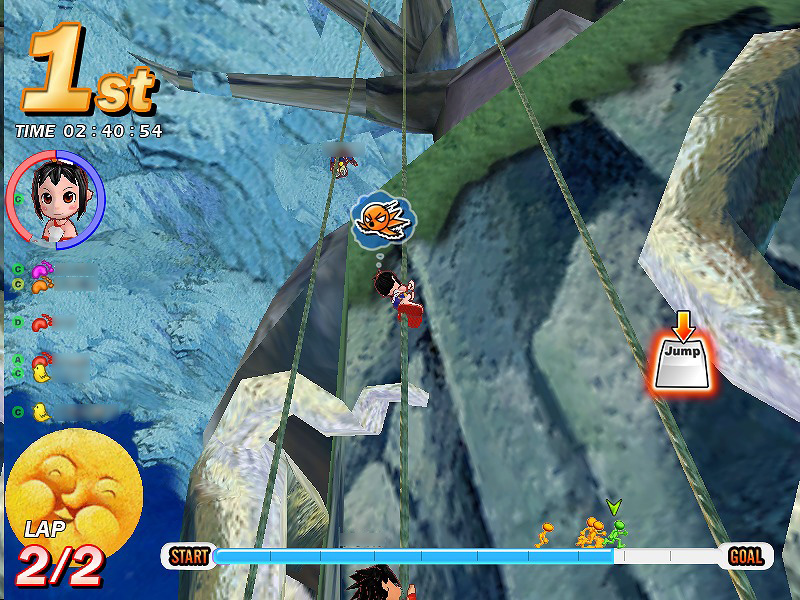 「ジャンプ」キーは,本作のプレイ中に最も多用する。通常のジャンプに加え,ジャンプ中にもう一度押すことで二段ジャンプが可能だ。ジャンプは障害物をかわすためだけでなく,ほかのプレイヤーキャラクターを踏みつけ,気絶させるためにも活用できる。またスタート時などの高所からの落下の際には,ジャンプキーを連打することでキャラクターが回転し,落下速度が高まる。そのほか,蔦を登ったり,水流に逆らって泳いだりする場面でも,このジャンプキーでスピードアップができるのだ。