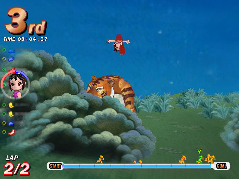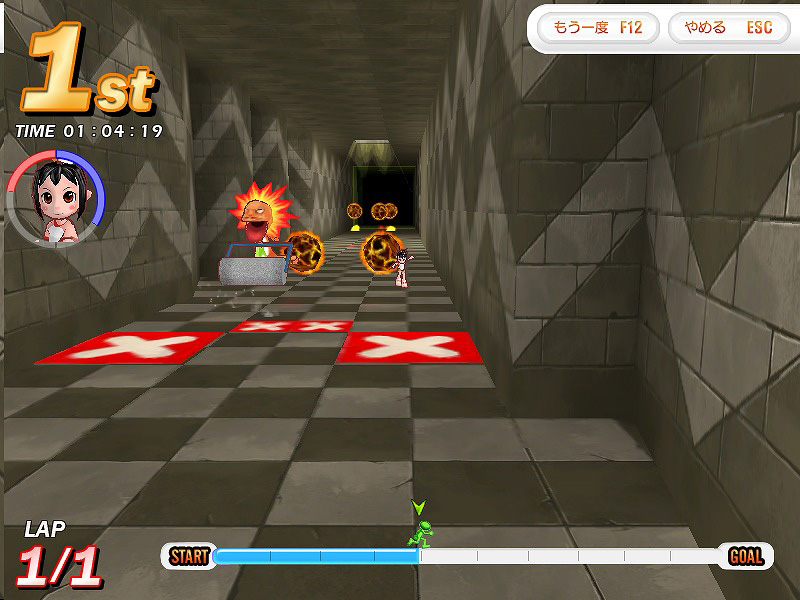 「チキンラン」は,前方を走っているプレイヤーを追尾して転倒させる,実にオフェンシブかつ,オーソドックスな妨害アイテム。ジャンプでかわしても着地地点に追尾するので,基本的に回避手段はないといっていい。むしろやられたらやり返す,くらいのスピリットで挑むべし。