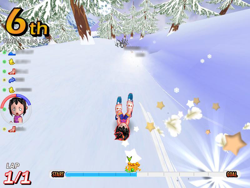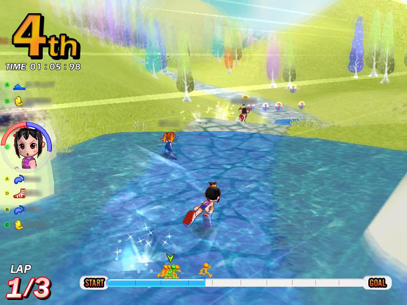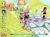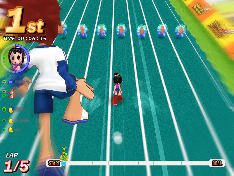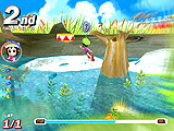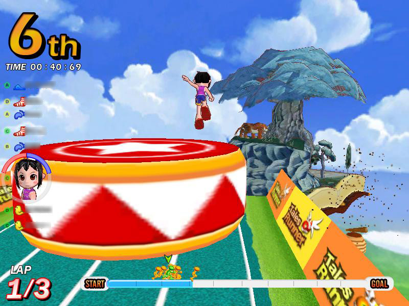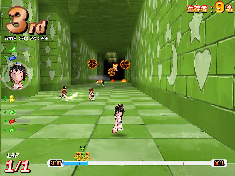 さらに,駆け引きという点でもう一つ気をつけたいのは,アイテムを使わない妨害手段,「踏み付け」と「突き飛ばし」だ。これは前回でも少し触れたが,人が密集するスタート地点ではとくに気をつけなければならない。着地位置に注意し,踏まれない位置取りを心がけよう。アイテムが登場しないサバイバルコースでは,唯一の妨害手段がこれになる。踏みつけられると大抵が即,ゲームオーバー。まさに殺るか殺られるか。そこは踏まれる前に踏んでやる,くらいの意気込みで切り抜けよう!