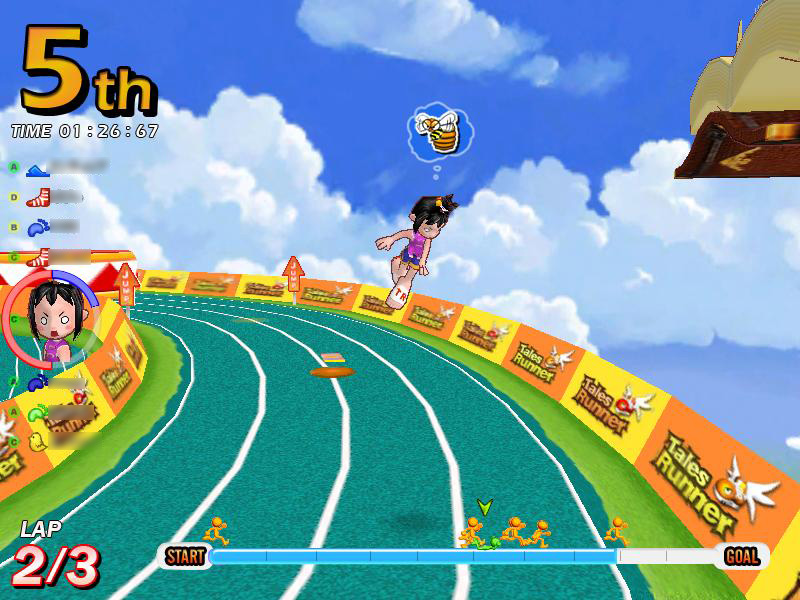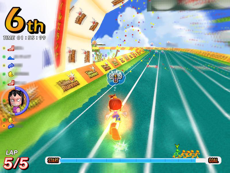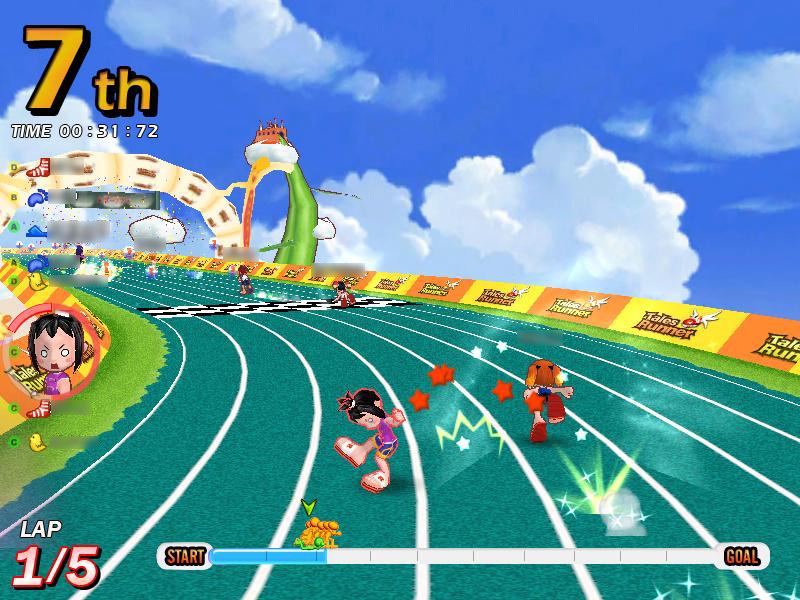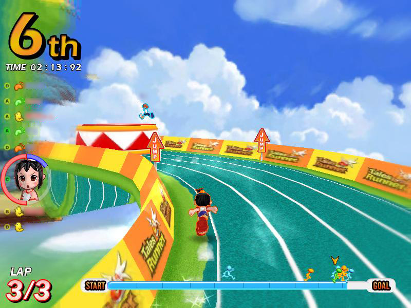 一つめは「ダッシュ2段ジャンプ」。ゲーム中,上級者プレイヤーがピョンピョンと飛び跳ねながら,ものすごいスピードでぶっちぎって行くのを目にしたことがあるだろう。この技が「ダッシュ2段ジャンプ」だ。テイルズランナーでは,ジャンプ中のスピードは,ジャンプ前のスピードを引き継いでいる。つまりダッシュジャンプをすることで,ジャンプ中はスタミナゲージを使わずに,ダッシュのスピードが維持できるというわけだ。これを2段ジャンプに絡めて使用すると,最小限のスタミナ消費で,長時間トップスピードを維持できる。