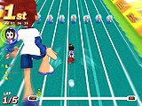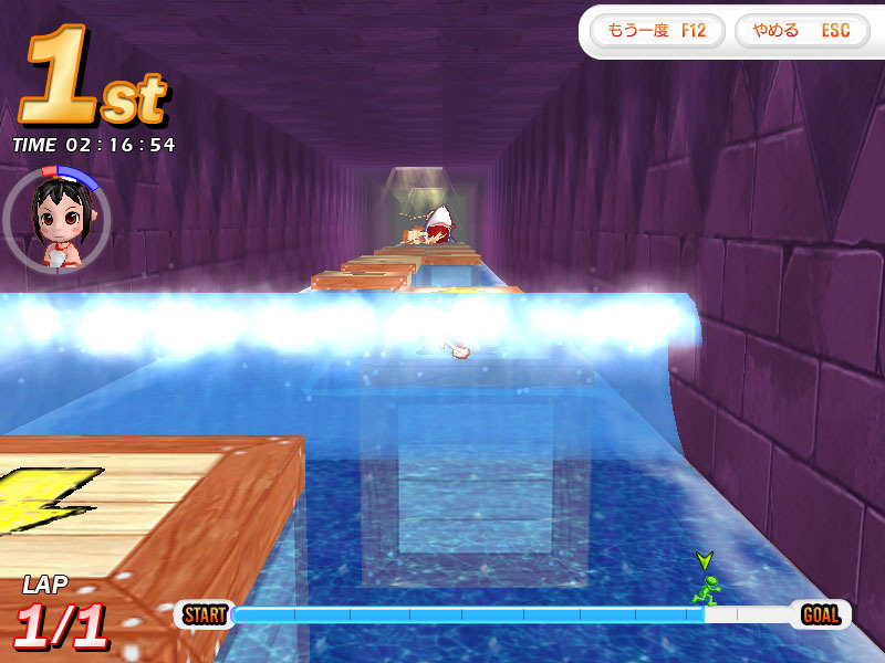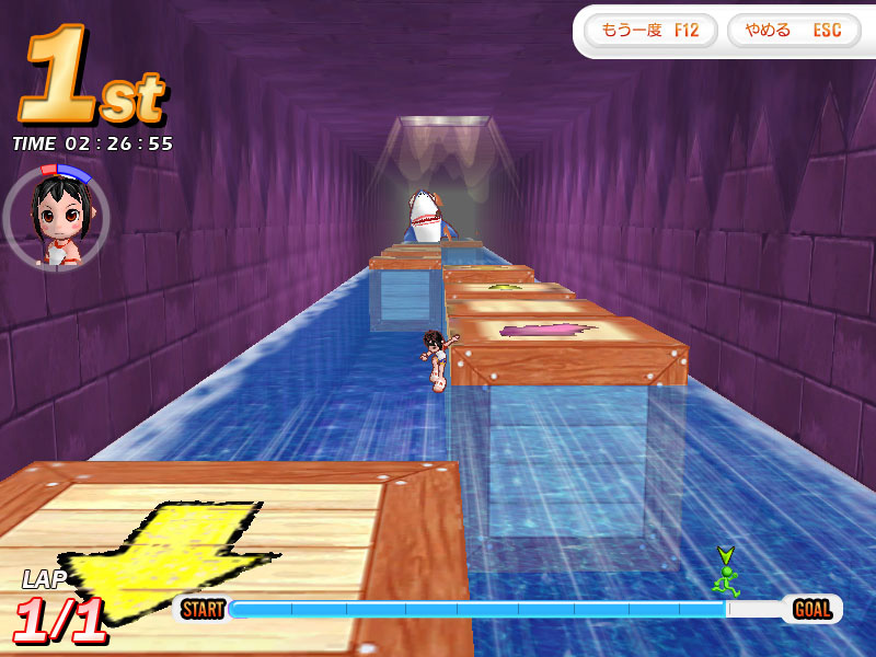 「マドロスジョー」は,水に浮かぶブロックの上を走る「サバイバル」コース。サバイバルコース全般にいえることだが,これはとにかく走ってブロックの配置を覚えるしかないだろう。ブロックから落ちてしまうと,次のブロックまで泳がざるを得なくなり,減速は免れない。とくにコース後半になると,ブロックがまばらになり,間隔も大きくなるので,次に跳ぶブロックを選ぶひまがなくなってしまう。また床のある場所が少ないので,後ろから追いかけてくるサメを引き離すチャンスも限られている。スタートダッシュに失敗するとかなりの痛手になるので,気をつけよう。