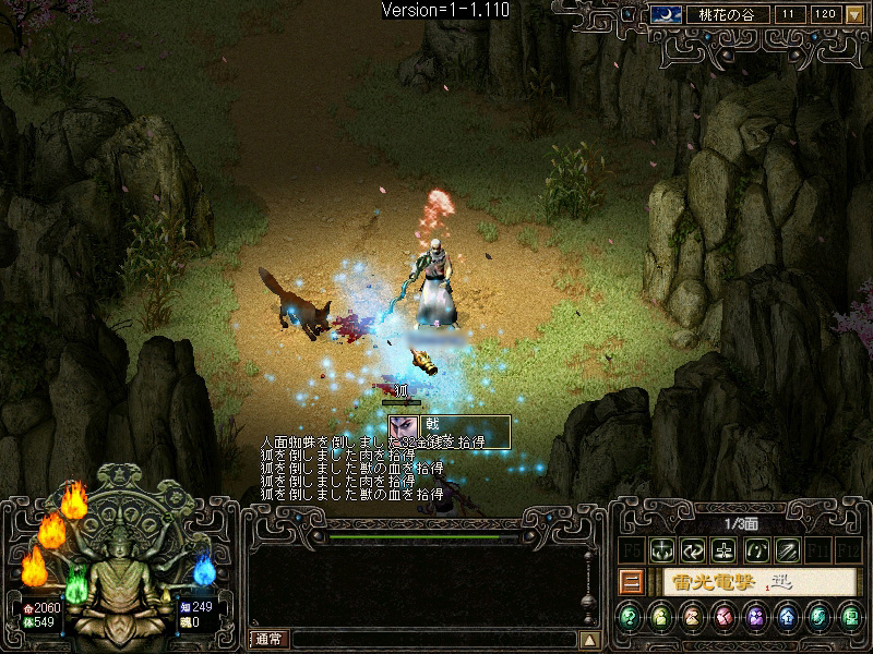 桃花の谷に生息するモンスターは,大鼠,狐,猪,白狐,人面蜘蛛,岩鬼の順に強くなっていく。といってもどれも中立的な性格で,こちらが手を出さなければ襲いかかってくることはなく,余裕を持って戦えるだろう。一つだけ注意しなければならないのが,妖魔を攻撃したとき,同種の妖魔が付近にいると,そちらも連れ立って攻撃してくること。体力に余裕があるならまだ問題は少ないが,そうでないときだと袋叩きにあって即死ということもある。周囲には気を配りながら戦うべし。