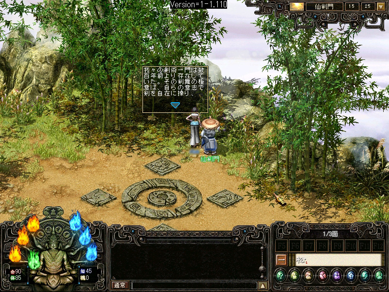 キャラクターメイキングを終えてゲームをスタートすると,剣宗(けんそう)は仙剣門(せんけんもん),戟門(げきもん)は神戟門(しんげきもん),詭流(きりゅう)は聖詭門(せいきもん),幻道(げんどう)は幻道門(げんどうもん)という場所に現れる。スタート地点には師匠と大先輩がおり,師匠は冒険の心得を説いてくれ,大先輩は武術場へとテレポートさせてくれる。