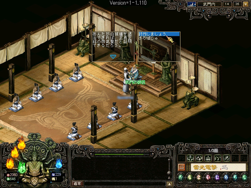 武術場へテレポートしたら,早速修行だ。武術場の隅には「捕らわれた邪鬼」と呼ばれる鎖につながれた妖魔がおり,これを殴る(左クリックする)ことで経験値が稼げる。「捕らわれた邪鬼」は反撃してこないし,死ぬこともないので,ひたすら殴れば経験値をどんどん稼げるはずだ。