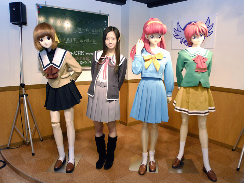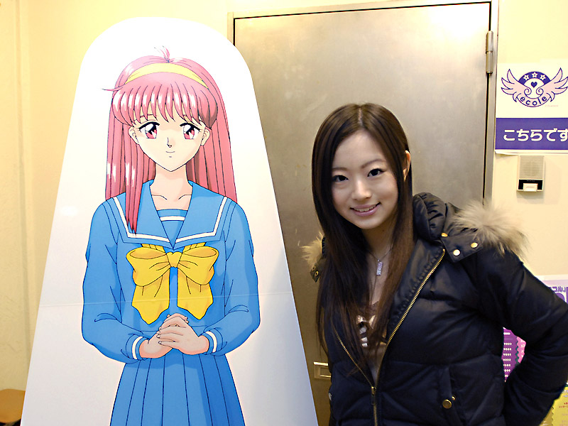 さてさて。落ち着いたところで改めて店内を見渡すと,教室風の店内の窓際には,ずらりと並んだ9台のTMO用PC。しかしそれ以上に目を引くのは,詩織ちゃん,陽ノ下光ちゃん,牧原優紀子ちゃんという,ときめきメモリアルシリーズ歴代ヒロインの等身大フィギュア。どの子も,ものすごく高そうです。並んで写真を撮ったついでに,こっそり彼女達の下着チェックもしてみました。みんな,きちんと着けてましたよ。でもちょっと幼い感じかな。ちなみにスリーサイズは,高校3年生のときのものを再現しているそうです。高校生って,体形が変わりますからね。そうそう,残念ながら男性は彼女達に触っちゃだめだそうです。ご注意下さいね。