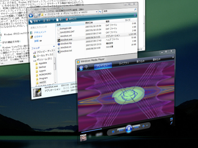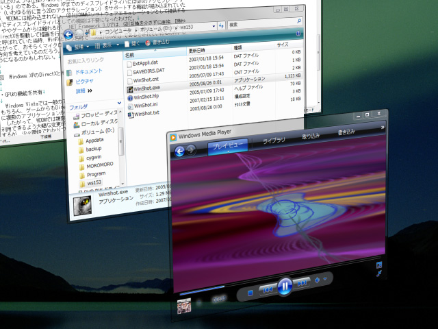 ただデスクトップが派手になっただけに見えるAeroだが,よく見るとウインドウに対してアルファブレンディングが適用され,“ウインドウの向こう”が透けて見えている