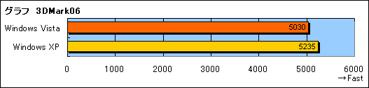では,そのロスは3Dグラフィックスの描画性能にどれだけ影響するだろうか? 表のとおりハードウェアの構成を一致させた状態で,Windows VistaとWindows XPからそれぞれ「3DMark06 v1.1.0」(1024×768ドット,標準設定)を実行した結果をグラフに示してみた。
