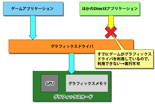 Windows Vistaでは,一般のアプリケーションがDWMを通じてDirectXを利用する。そしてもちろん,ゲームからもDirectXを利用しなければならないわけで,従来のDirectXのように複数のアプリケーションからの同時利用が難しい仕様では困ってしまう。