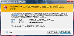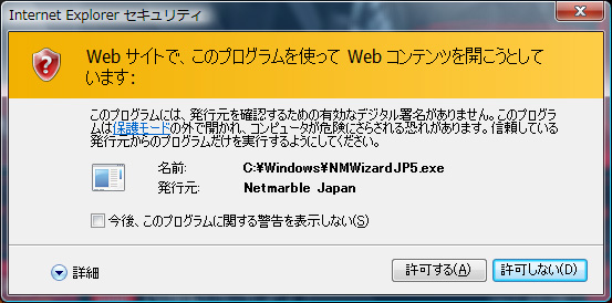 インストール時やゲーム起動時には,かなり高い確率でセキュリティの確認メッセージ(=ダイアログ)が表示されるが,基本的にすべて[OK]や[許可する]などといったボタンを選ぶ必要がある。メッセージのパターンは大きくわけて2種類。一つはユーザー権限に関するもので,もう一つはインターネット通信あるいはActiveXに関するものだ。このメッセージやダイアログを無効にする方法は今のところないため,ゲームが起動するまでクリックし続けよう。