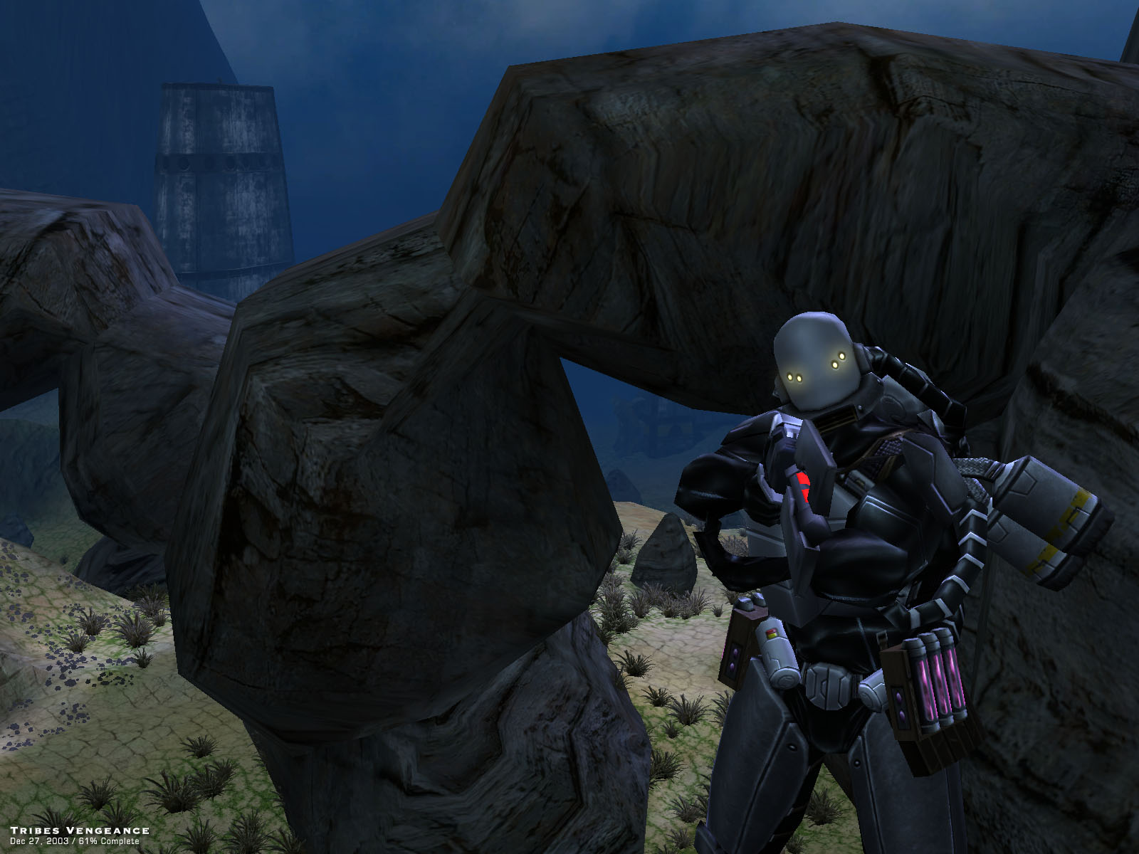 現在のデモを見るだけでは,そう判断されても仕方ないかもしれません。しかし,例えばパック一つをとっても大きく変化しており,クラス作りを明確にするという点で前作以上のデキになっているのは確かです。Tribes:Vengeanceにおけるパックは,アクティブ(能動的/プレイヤーの操作で発動)とパッシブ(受動的/自動的にプレイヤーに与えられる能力)の二つの要素で成り立っており,現在公開できる唯一の「エネルギーパック」を例に出すと,アクティブはスピードブーストで,より高い場所にまで飛び上がれたりする能力,そしてパッシブはより高速でリチャージできたりする能力です。どちらかといえば,スカウトやスナイパー系のプレイに向いていますね。