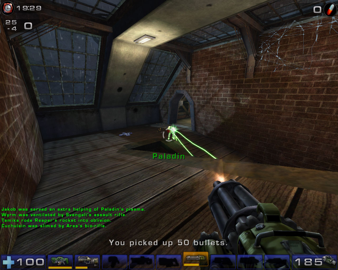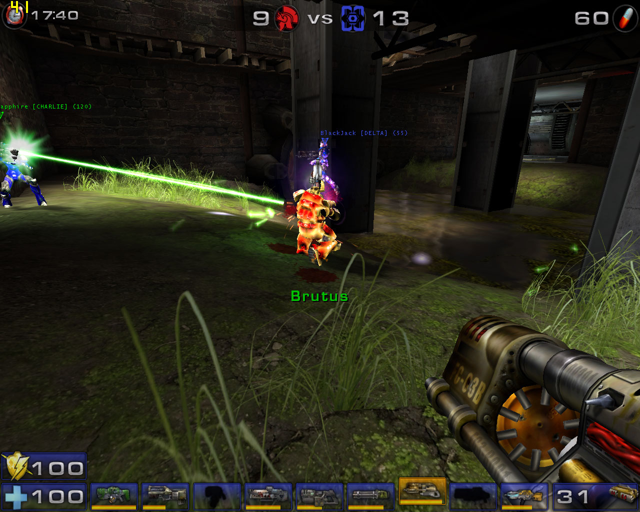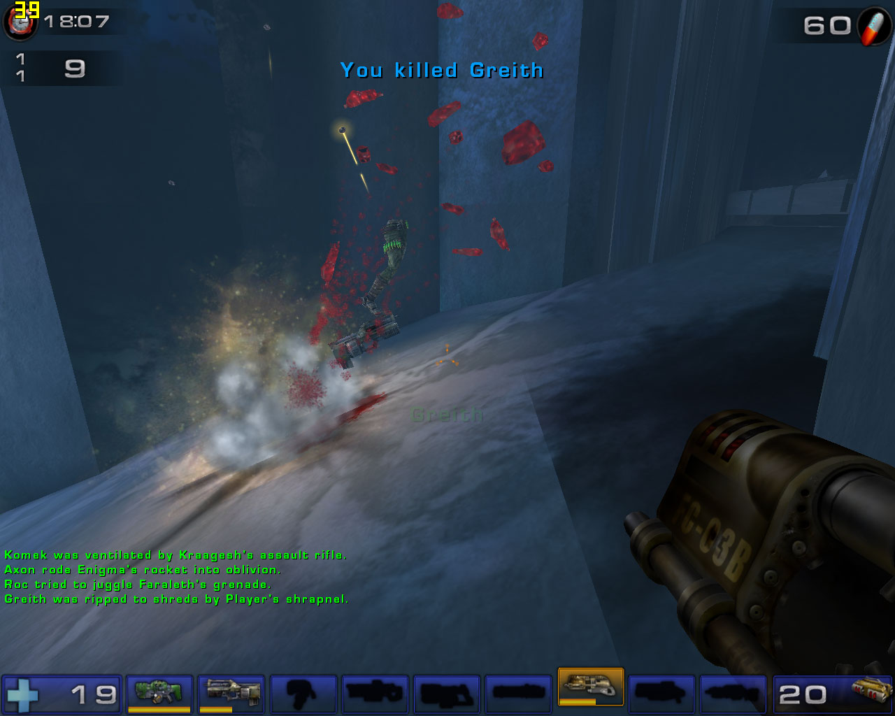 ゲーム中に,自動的に自分のレベルに合うようにBotの強さを調整するには,同じくルール設定の画面下方にある"View Advanced Options"をチェックし,Bots内にある"Auto Adjust Bots Skill"をチェックすればよい[画面13]。 ![]() 1対1に慣れてきたら,登場Bot数を2体,3体と増やしていき,DeathMatchならではの乱戦を味わってみよう[画面14]。それと同時に,各武器の特性を覚えていくこと。どの武器もそれぞれ特徴があるので,自分の使いやすい武器を見つけるのだ。 ちなみに筆者は,一発の威力が大きく,爆風を発生させられるRocekt Launcherと,破砕グレネードを発射する攻撃範囲の広いFlack Canonのサブ攻撃[画面15]がとくに好きで,Bio-Rifleはあまり好みじゃない[画面16]。