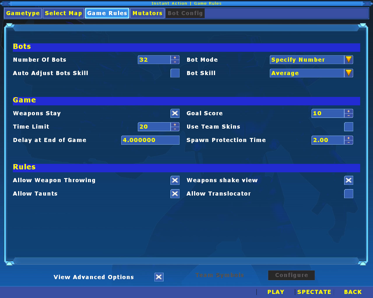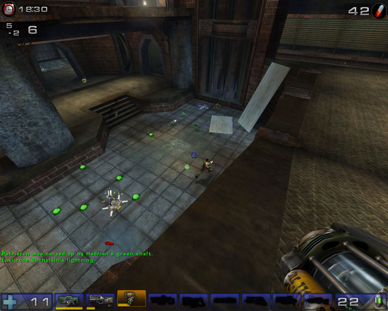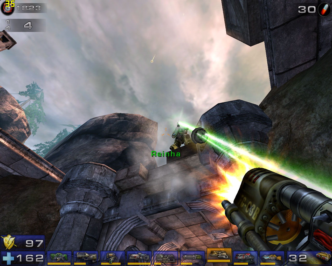 ゲーム中に,自動的に自分のレベルに合うようにBotの強さを調整するには,同じくルール設定の画面下方にある"View Advanced Options"をチェックし,Bots内にある"Auto Adjust Bots Skill"をチェックすればよい[画面13]。 ![]() 1対1に慣れてきたら,登場Bot数を2体,3体と増やしていき,DeathMatchならではの乱戦を味わってみよう[画面14]。それと同時に,各武器の特性を覚えていくこと。どの武器もそれぞれ特徴があるので,自分の使いやすい武器を見つけるのだ。 ちなみに筆者は,一発の威力が大きく,爆風を発生させられるRocekt Launcherと,破砕グレネードを発射する攻撃範囲の広いFlack Canonのサブ攻撃[画面15]がとくに好きで,Bio-Rifleはあまり好みじゃない[画面16]。