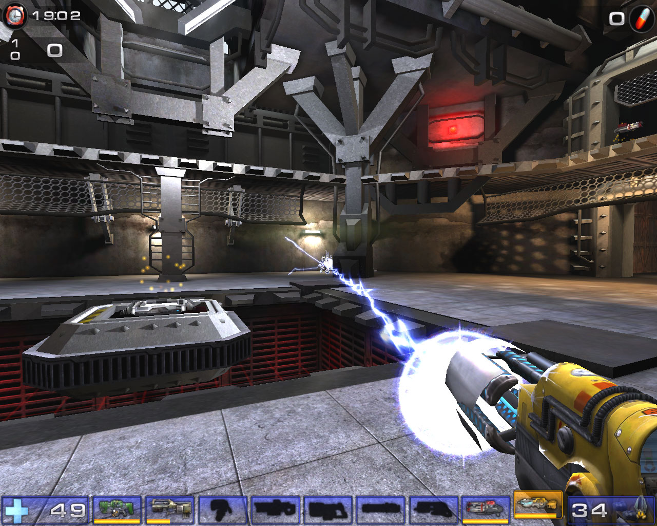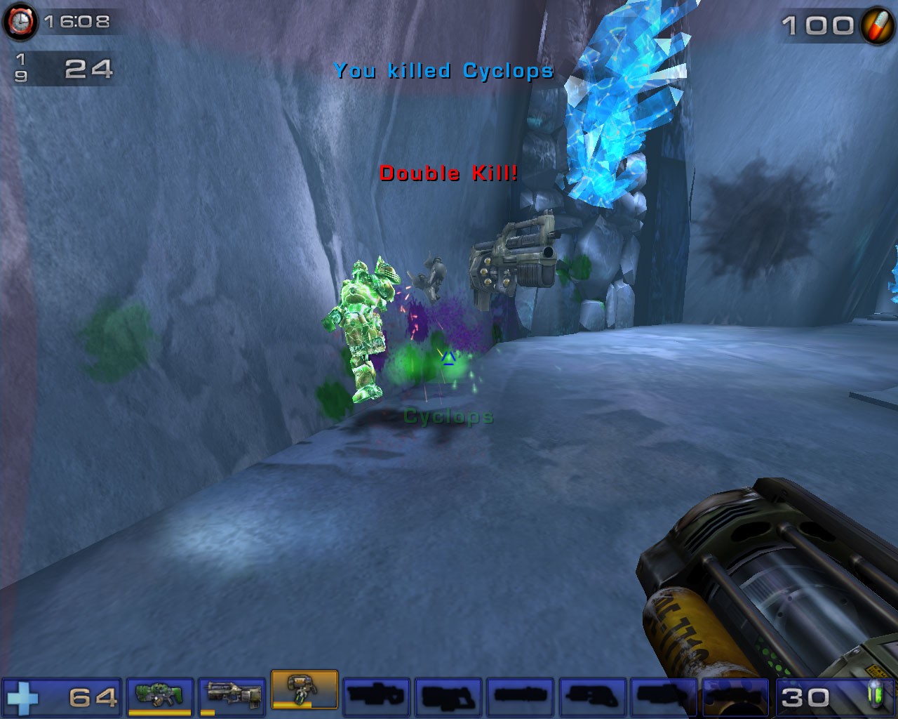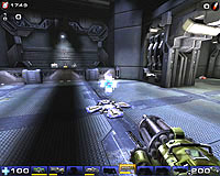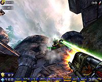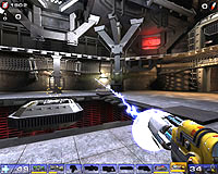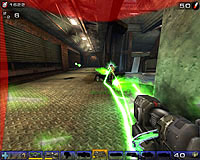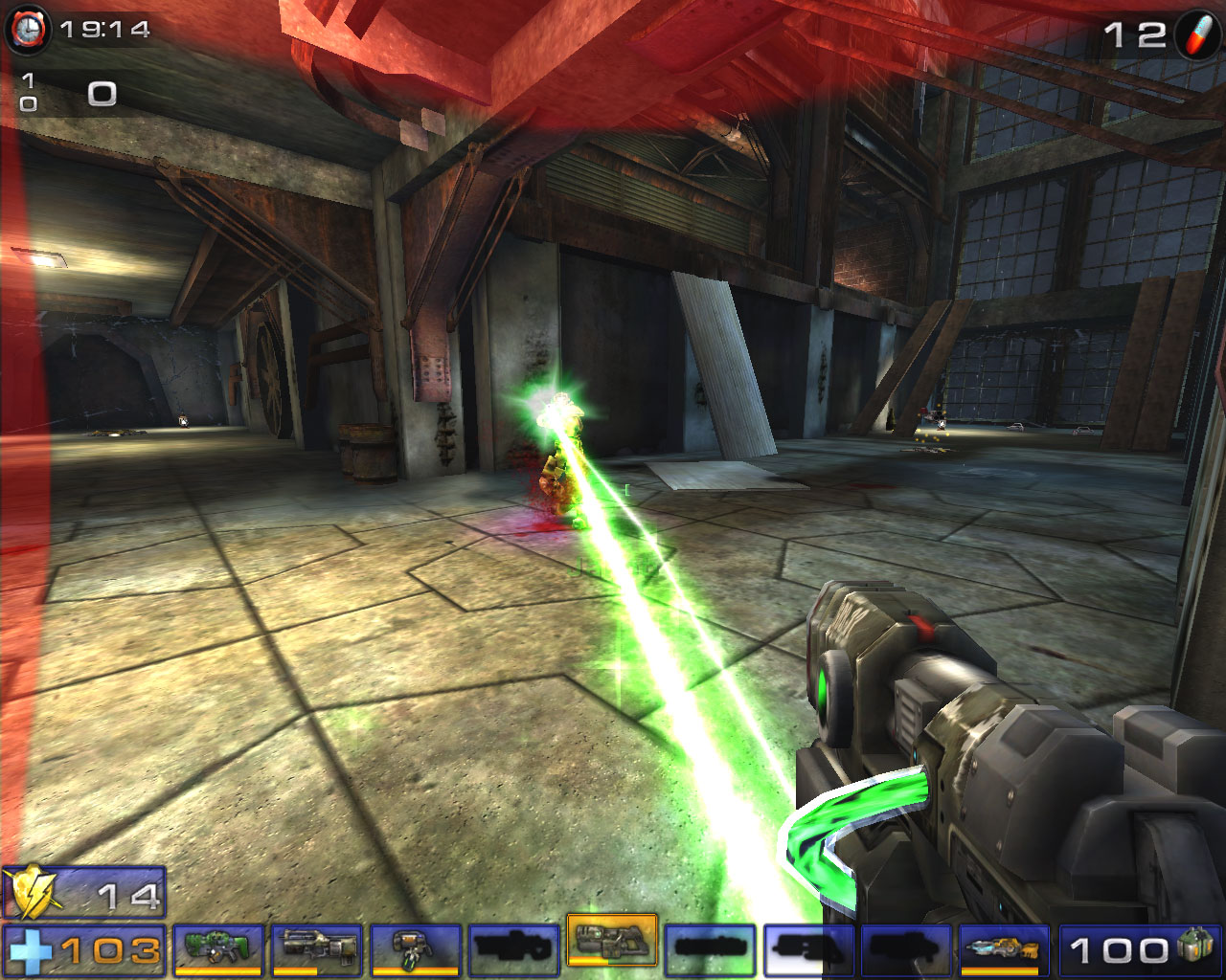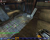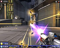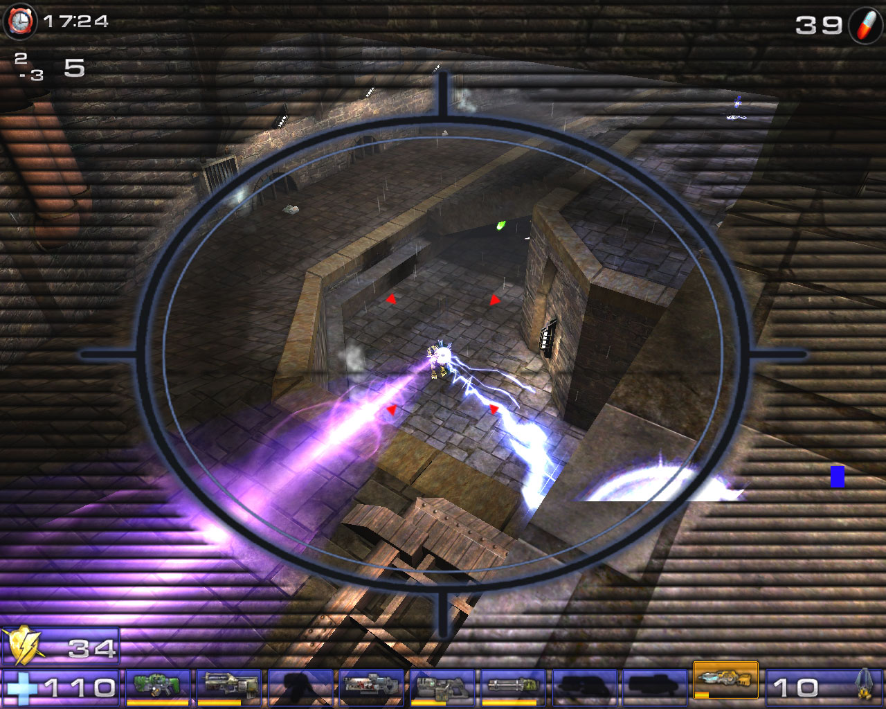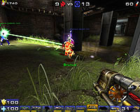 より正確な照準を身につけたい場合は,Shock Rifle[画面9]かLightning Gun[画面10]のみに限定して練習するといい。この二つの武器は連射が利かず,また着弾地点も狭く(ほぼ点)なので一発必中を期する必要があり,より正確な照準が求められるからだ。連射が利く武器(Assault RifleやMini Gun,Link Gun)や,破片が散ったり爆風が発生する武器(Flack Canon,Rocket Launcher)は着弾地点が広いため,多少照準が甘くてもなんとかなったりする[画面11,12]。 Shock RifleやLightning Gunで正確に命中するようになったら,かなり上達しているはずだ。